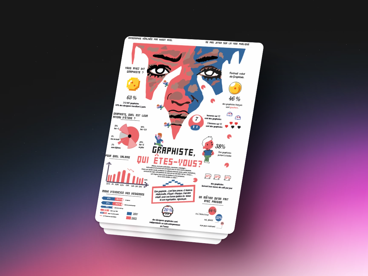 Dans un contexte universitaire, nous étions chargés de concevoir une infographie sur un sujet spécifique, avec tous les étudiants travaillant sur le même thème et dans un laps de temps fixe. Bien que cette approche standardisée ne m’ait pas enthousiasmé, elle m’a néanmoins incité à réfléchir et à réaliser l’importance d’avoir un délai plus souple pour la création artistique et conceptuelle. Illustrator Tous les éléments visuels de l’infographie, y compris les graphiques et les illustrations, ont été entièrement créés sur Illustrator, attestant d’un processus de conception complet et détaillé au sein de cette plateforme logicielle. Couleurs & Typographies Dans ce projet, le choix des couleurs et des polices de caractères revêtait une importance capitale pour mettre en valeur les informations essentielles. Nous avons opté pour les polices Lobster et Pixel Gosub, et les couleurs utilisées étaient #FF6666 et #336699. Thème plutot libre donc : Explorer de nouvelle créativités Plus d’investisement dans le projet Favorise la diversité des perspectives Encourage l’autonomie Offre une flexibilité totale Recherche Phase de conception Conclusion Avant de commencer cette infographie, j’ai passé beaucoup de temps à étudier différentes infographies sur Behance pour trouver de l’inspiration. Cette démarche m’a été particulièrement bénéfique lors de la création des graphiques. Pour cette phase, j’ai eu l’idée de diviser le travail en deux parties (ce qui était nécessaire compte tenu du sujet) : une partie en version pixel et une autre en version non pixel, accompagnée d’une représentation d’une personne avec des mains. Ce projet a été une opportunité précieuse pour développer mes compétences en design sur Illustrator. Après avoir consacré environ 30 heures à cette infographie, j’ai été évalué à 16/20, ce qui témoigne de l’engagement et de l’effort investis dans ce travail.