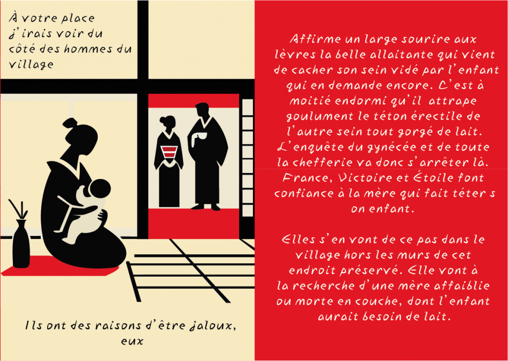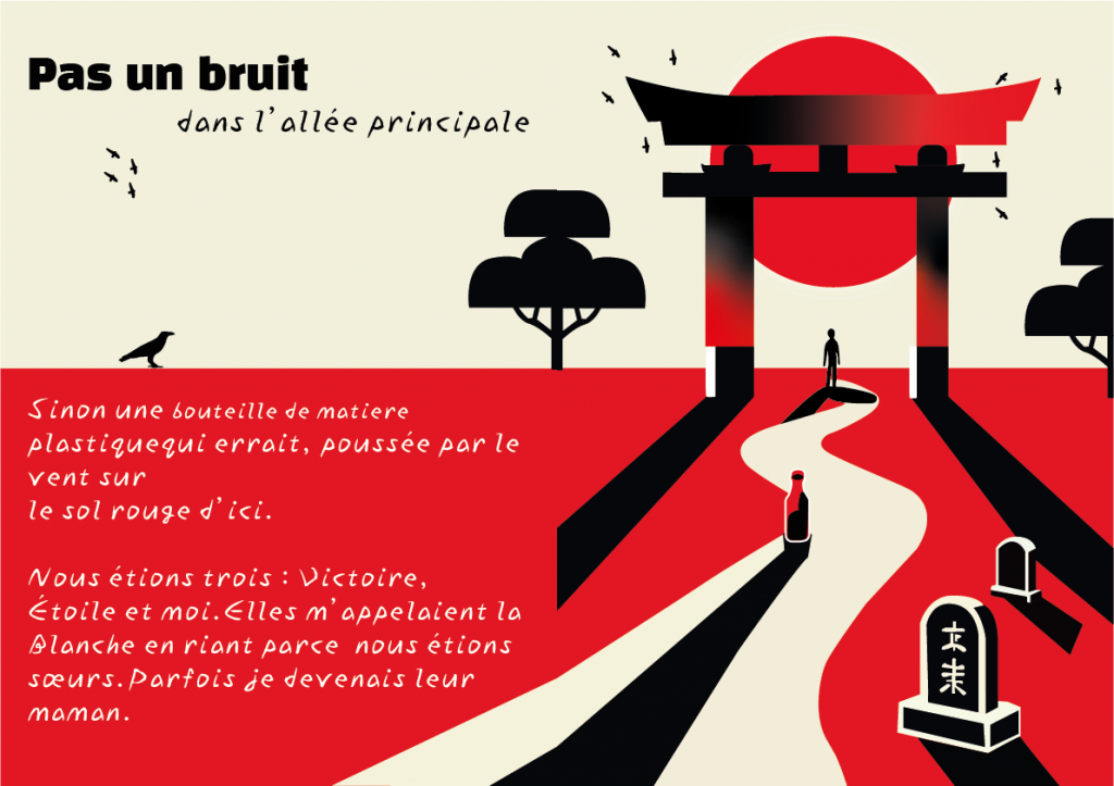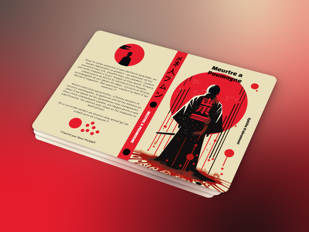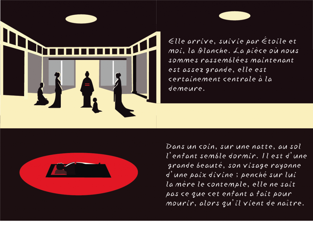 Pour ce projet, j’ai inventé un conte du début à la fin. J’ai aussi fait toutes les illustrations moi-même, en choisissant un style sombre, inspiré de la culture japonaise, pour bien coller à l’ambiance de l’histoire.